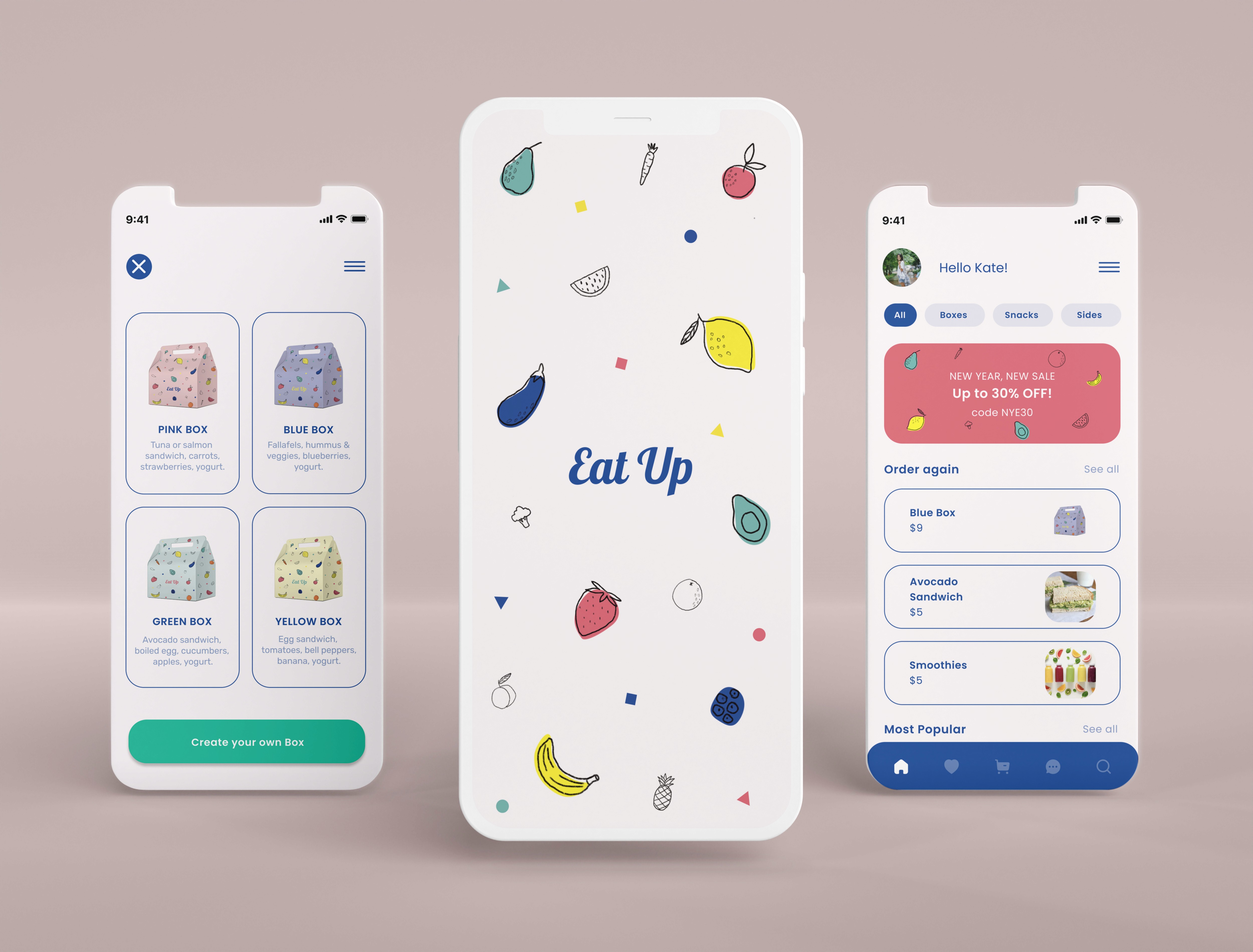 Eat Up is a healthy meal kit for children - a fun, illustrated lunchbox delivered to schools or homes, with cute food shapes and kid-friendly recipes. The concept includes a mobile app for ordering and delivery. A full product design project from research to physical packaging, visual identity, illustration, mobile prototype, and concept video.
